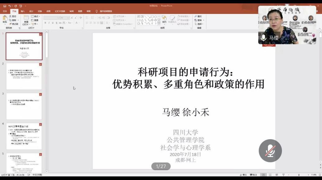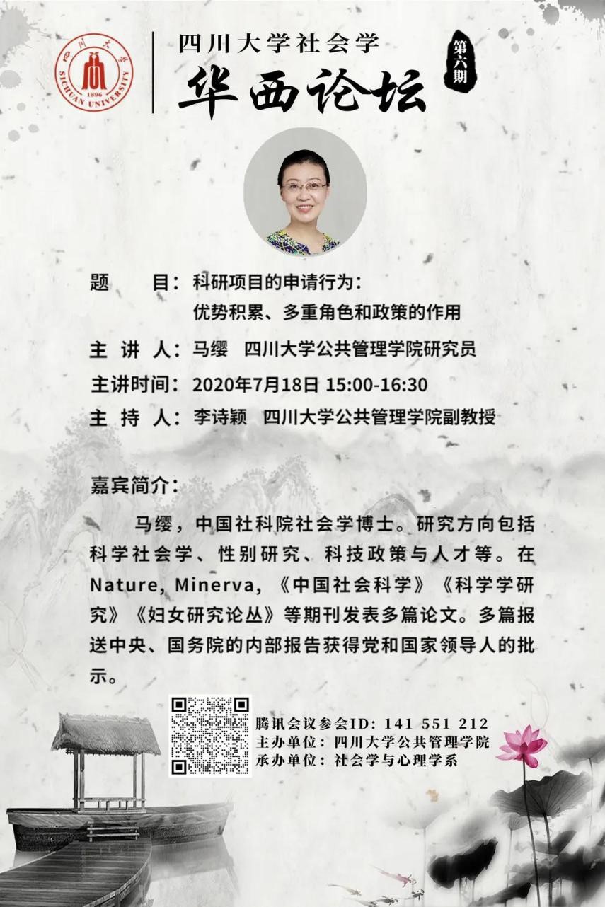 2020年7月18日下午15:00,十大买球的正规网站社会学华西论坛云系列讲座第六期于线上成功举行。十大买球的正规网站社会学与心理学系马缨研究员发表了题为“科研项目的申请行为:优势积累、多重角色和政策的作用”的精彩演讲。讲座由社会学与心理学系李诗颖副教授主持,百余名来自我校和省内外兄弟院校的师生参加了讲座。