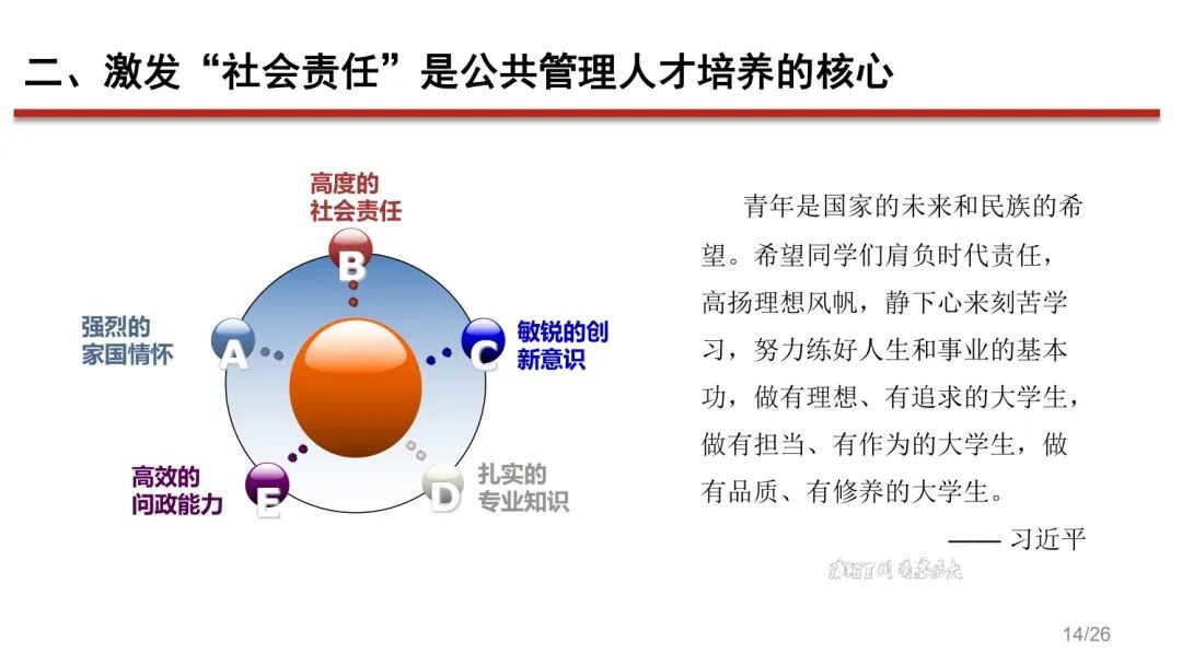 围绕公共管理人才培养的价值理性,姜晓萍教授指出培育“公共精神”是公共管理人才培养的关键,担当“社会责任”是公共管理人才培养的使命,警惕“价值迷失”是公共管理人才培养的必须。