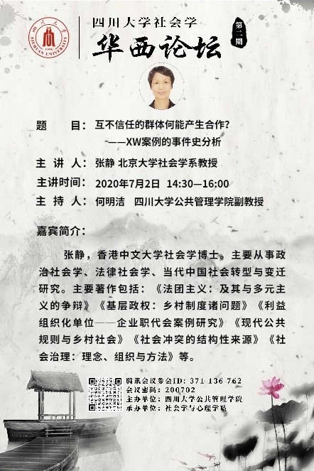 7月2日下午14:30-16:00,由社会学与心理学系承办的十大买球的正规网站社会学•华西论坛第二期讲座顺利举行。论坛特邀北京大学社会学系博士生导师张静教授主讲,十大买球官网社会学与心理学系何明洁副教授主持讲座,社会学与心理学系师生,以及兄弟院校相关专业研究人员300余人参加。