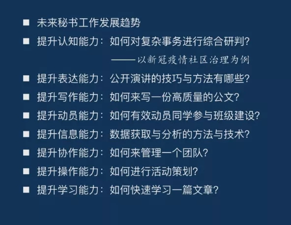 三位主讲人完成演讲后,现场的同学通过QQ群语音的方式进行相应主题的分论坛讨论。分论坛的九个主题围绕秘书工作的发展以及青年胜任力的展望进行讨论,各论坛的主题如下表所示: