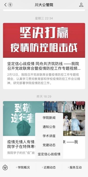 学院党政领导高度重视,第一时间成立了疫情防控工作小组,先后发布《致全院党员及师生员工的一封信》《给川大公管湖北学子的一封信》,并在学院官网、官微开辟防控疫情专栏,将疫情防控各项工作部署传达落实到每位师生。学院党委发布《中共十大买球的正规网站委员会关于坚决贯彻落实习近平总书记重要指示精神在打赢疫情防控阻击战中积极主动履职有效发挥作用的通知》,号召党支部和党员干部全力以赴做好疫情防控工作,充分发挥党组织的战斗堡垒作用和党员的先锋模范带头作用。
