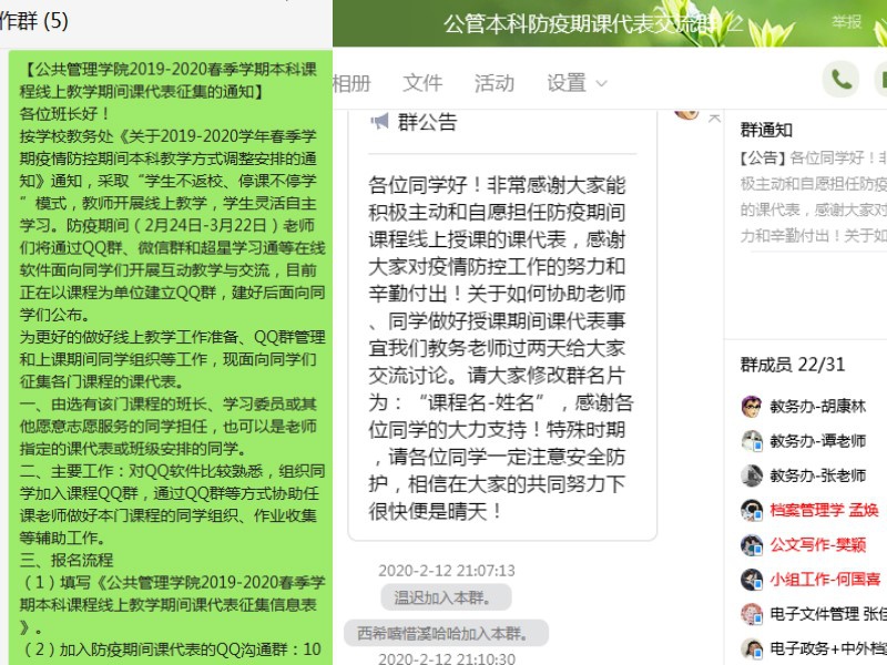 学院党政领导带领各办公室提前规划,认真准备,全力做好疫情防控期间各项工作。学院教务办公室按照教育部、四川省教育厅和研究生院的相关通知,贯彻落实“停课不停教、停课不停学”,制定《2020年春季疫情防控期间教学准备工作方案》,组织任课教师参加在线教学方式培训,组建课程工作qq群,征集线上课程“课代表”,实施湖北学子防疫期间学业关怀计划,努力做到防控期间教学和疫情过后正常教学的有机衔接。学院科研办公室通过线上发布信息等多种方式,扎实组织各类科研项目尤其是疫情防控相关项目的申报工作。学院外事办公室建立了外籍、港澳台侨师生工作群,及时通知相关信息,帮助师生解决实际困难。学生工作办公室向毕业生线上推送华为、人民日报社、军队院校、中建等100余家优质用人单位招聘信息,积极弘扬“宅着也要学”的精神风貌,联合校友企业华图教育助力学生在家备战求职,开展在线学习,保质保量推进毕业生工作。党政办公室加强学院大楼管理、实施公共区域、室内卫生清洁和消洒工作,采购消毒液(片)、洗手液等防疫物资,搭建学院welink视频会议平台,做好各项防控保障工作。