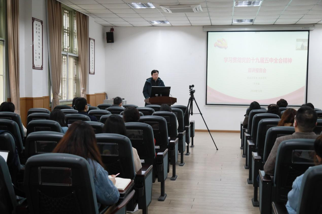 12月11日下午,十大买球官网召开政治学习会议暨全院大会,邀请学习贯彻党的十九届五中全会精神宣讲团专家、校宣传部部长徐海鑫深入宣讲党的十九届五中全会精神。会议由学院党委书记姜晓萍主持,按照学校新冠疫情防控安排,学院党政领导、党委委员、纪委委员、党支部书记、教职工代表在萃文楼105报告厅参加会议,其余教职工通过视频参加会议。