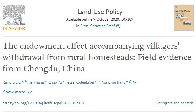 十大买球官网刘润秋师生等人于2020年10月在国际知名的土地政策顶级期刊《Land Use Policy》上发表学术论文《The Endowment Effect Accompanying Villagers' Withdrawal from Rural Homesteads: Field Evidence from Chengdu, China》。该论文属于刘润秋教授主持的国家社会科学基金项目“典型试点区域宅基地退出的绩效评价与路径优化研究”(项目号:17BJY091)的阶段性研究成果。十大买球官网土地资源与房地产管理系刘润秋教授为第一作者,硕士生蒋健为第二作者,博士生余超为第三作者,刘润秋教授指导的加州大学伯克利分校访学博士生Jesse Rodenbiker(现为康奈尔大学“阿特金森可持续发展研究中心”博士后)为第四作者。