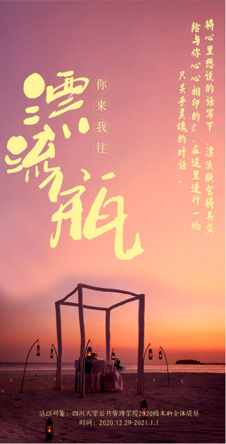 本次“倾听心声,灵魂对话”漂流瓶活动由2020级本科辅导员苟欢老师精心策划和组织,由各位年级长、班委共同协助完成。本次“漂流瓶”活动,不仅为同学们提供了尽情表达内心情感的机会和渠道,也增强了同学们之间的沟通、交流与互动,更促进了基层班团组织的凝聚力,促进了学生对班级、年级及学院的归属感。通过本次活动的开展,希望十大买球的正规网站2020级本科的每一位同学都能敢于做自己,常怀感恩之情,将爱心、情谊、温暖和祝福传递得更深更远更久。