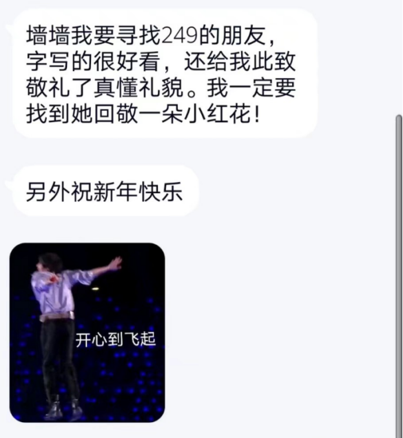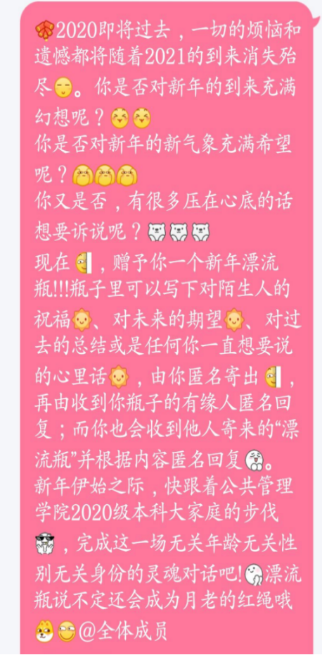 本次活动中,每位同学都能收获到两个匿名笔友,一位为自己带来温暖的新年祝福,一位为自己排忧解难。在信件顺利完成漂流后,同学们意犹未尽,通过不同的方式对本活动进行了欢愉的讨论,在积极寻找自己“漂友”的同时,也表达出对漂流信件的满心好奇和期待。
