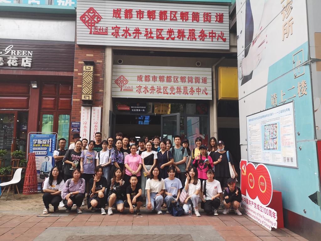 师生在成都市郫都区凉水井社区党群服务中心合影留念