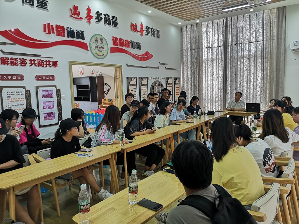 接下来,村书记汪生富亲自接待了参访师生,进行座谈交流。汪书记谈到:“乡村振兴永远在路上”。他阐释了乡村振兴核心问题的变化历程:从人民温饱问题到弱势群体生存环境问题,再到全体人民居住环境的全面改变,以及未来可能面临的挑战性问题。汪书记详细说明了关于乡村振兴的五个重要方面:环境振兴、经济振兴、文化振兴、人才振兴以及组织振兴的重要内容,并结合广福村的真实案例,深入浅出。“其实农村留有许多空间给年轻人……”,在座谈过程,他同时表达了对当代知识青年人才的尊重和殷切希望。座谈会最后,参会者积极提出关于本土社会组织、人才保留措施、化肥污染解决等问题,汪书记一一进行了耐心而细致的解答。两位老师也在问题讨论中提出自己的见解,营造了开放互动的交流氛围,学生在讨论中深入思考、受益颇多。
