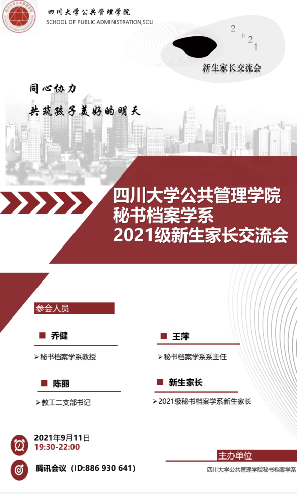 2021年9月11日,秘书档案学系2021级本科新生家长线上交流会成功举办。由于疫情原因,新生家长不能进校。考虑到家长普遍有深入了解子女所学专业的基本情况及与专业教师沟通的强烈意愿,秘书档案学系以云端在线的方式开启家校双方互动交流,乔健教授、系主任王萍教授、教工二支部书记陈丽教授与会并与在线家长进行了广泛深入的沟通。