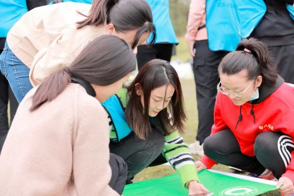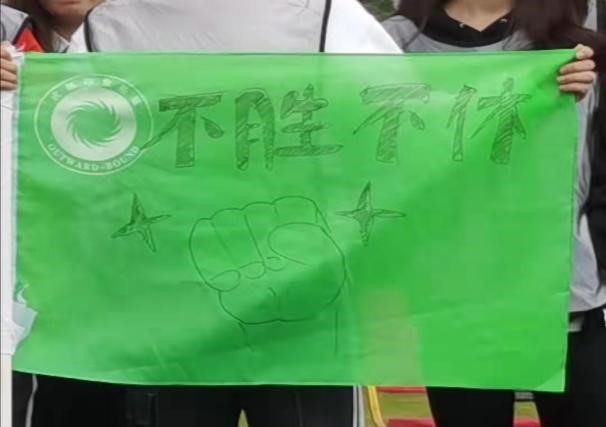 为充分调动同学们的积极性,此次拓展训练采用协作加竞赛的形式。在教练组的带领下,由队长牵头为各自的团队设计队名、队旗及口号,组成了势如破竹队、教练说的队、雷霆队、闪电六队、不胜不休队、欢欢喜喜队等15支队伍,同学们将一幅幅旗帜赋予了团队的色彩,各队在欢呼声中逐一展示口号和队形。