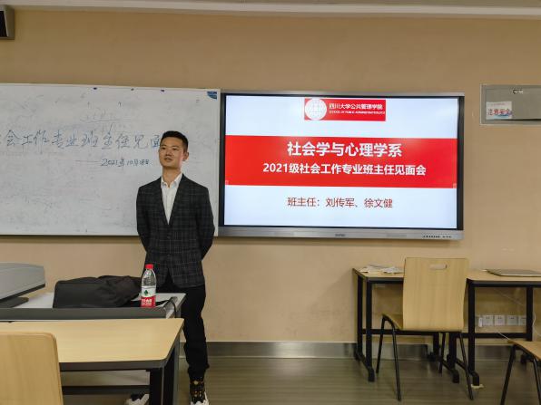 为了帮助同学们更好地了解社会学与心理学系全体教师的教学科研情况,促进专业教师与学生之间的交流互动,助力学业发展,2021级社会工作专业于10月19日晚在江安校区第一教学楼D506顺利开展了班主任见面会。会议由徐文健、刘传军两位班主任老师主持,2021级社会工作专业全班同学参加。