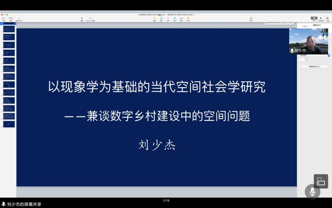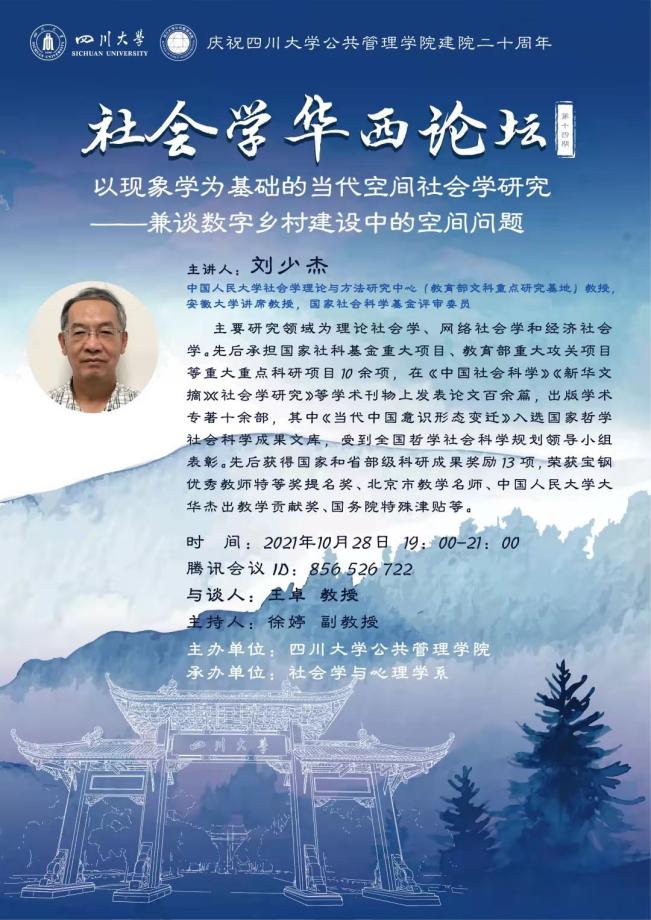 2021年10月28日晚上19:00,十大买球的正规网站社会学华西论坛系列第十四期讲座于线上成功举行。中国人民大学社会学理论与方法研究中心刘少杰教授开展了题为“以现象学为基础的当代空间社会学研究——兼谈数字乡村建设中的空间问题”的精彩演讲。本场讲座是学院院庆二十周年系列讲座之一,由社会学与心理学系系主任徐婷副教授主持,近二百位名来自我校和国内外兄弟院校的师生、学者参加了讲座。