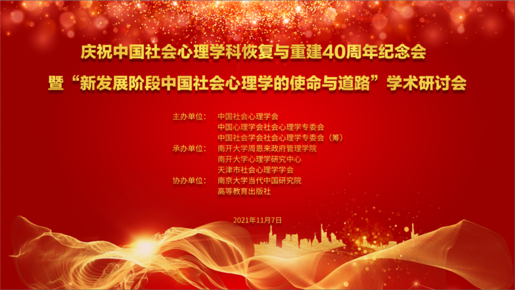 11月6日,中国社会学会社会心理学专业委员会(筹)召开了理事会议,共商学会发展大计。11月7日,中国社会心理学科恢复与重建40周年纪念暨学术研讨会在天津南开大学举行。本次会议由中国社会心理学会、中国心理学会社会心理学专业委员会、中国社会学会社会心理学专业委员会(筹)三家国家级社会心理学科组织主办,南开大学周恩来政府管理学院、南开大学心理学研究中心、天津市社会心理学学会承办,南京大学当代中国研究院、高等教育出版社协办。本次会议由线上与线下会议相结合的形式进行,十大买球官网社会学与心理学系特聘副研究员刘传军老师代表十大买球的正规网站在线参加了理事大会和学术研讨会。