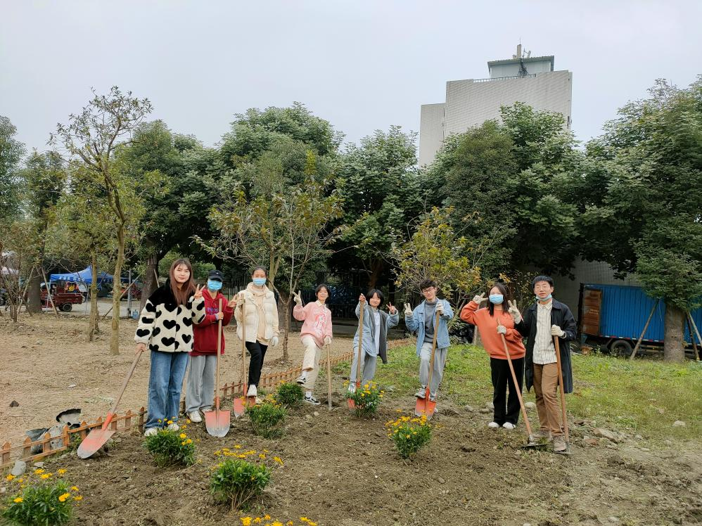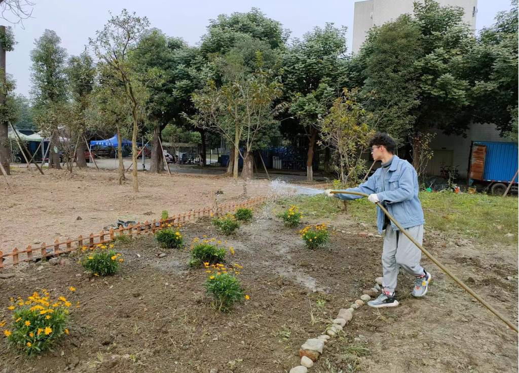 经过了前一日的除草耕地,原本荒芜的土地也变得可人了许多。由于13日下午同学们已提前将买好的满天星、杜鹃、木春菊植株搬到“开心农场”,14日下午3:30同学们到达农场后便迅速开始了植株种植。“慢工出细活”,同学们用铁锹细心刨出一个个小土坑,小心翼翼地将植株放进去,用土盖好,再用铁锹将土拍紧,最后用水管给植株浇水。下午5:00左右,一株株花儿就都种好了,原本荒芜的农场在大家的共同努力与精心装扮下变成了美丽的小花园,也成为十大买球的正规网站江安校区一处靓丽的风景。