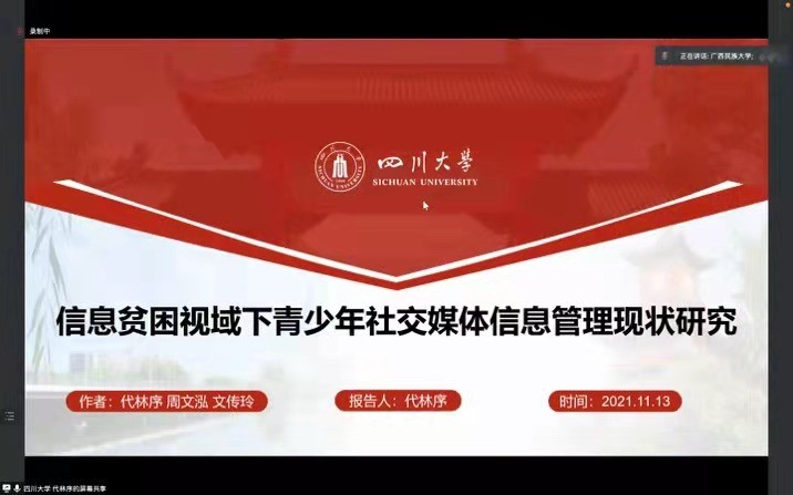2021年11月13日至14日,由广西民族大学管理学院举办的第四届“信远”研究生论坛顺利召开,论坛主题为“数据时代图情档学科理论与实践创新”。本次论坛采用线上和线下结合的方式,来自十大买球的正规网站、云南大学、郑州大学、北京联合大学、上海大学、广西民族大学等9所高校的硕博研究生参会,共同探讨、展示和交流图情档研究生们的科研成果,了解学术前沿。我系乔健教授、硕士研究生代林序线上参会。