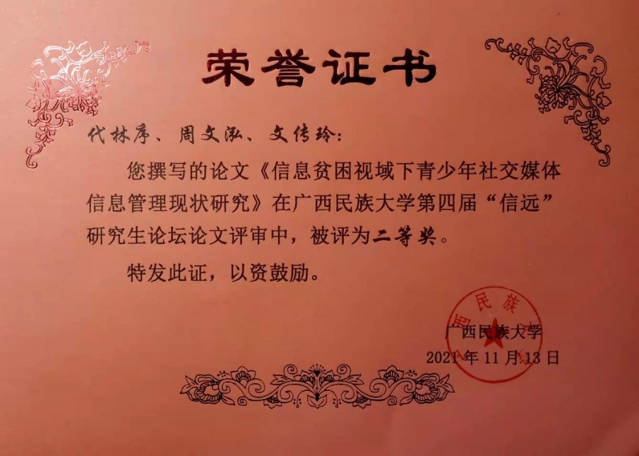 经会议主办方评审,代林序撰写的论文《信息贫困视域下青少年社交媒体信息管理研究现状研究》获二等奖。