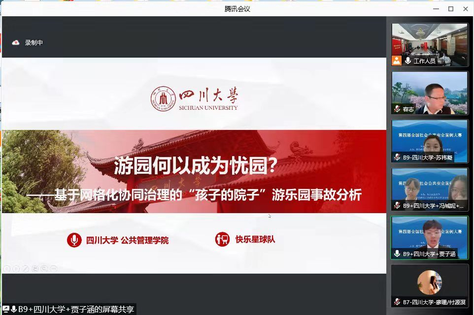 经过充分准备和激烈角逐,来自十大买球官网的两支学生队伍脱颖而出。由行政管理系的刘锐副教授指导,行政管理专业2020级本科生夏凡、冯城妮、贾子涵,以及劳动与社会保障专业2020级本科生单浩楠、苏祎凝组成的“快乐星球队”,完成了《游园何以成为忧园?——基于网格化协同治理的成都市“孩子的院子”游乐园事故分析》的案例分析报告,并通过决赛现场8分钟的陈词环节和7分钟的答辩环节,表现优异,荣获大赛一等奖。