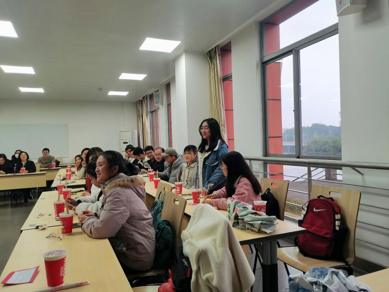 下一项是“传声筒”游戏。全部师生被分成四组,每组轮流在比赛中选出8名成员,第一人将主持人提供的信息(词语、成语、诗句等),演绎给队友,只能向队友传递声音效果和动作表情,然后再依次传递给挡板后的下一名队友,一直到最后一名队友接收到信息,并猜测动作主题所代表的词语或者是句子,在规定时间内答对最多的组获胜。这一环节一方面放松娱乐,另一方面也进一步拉近了师生之间的距离。