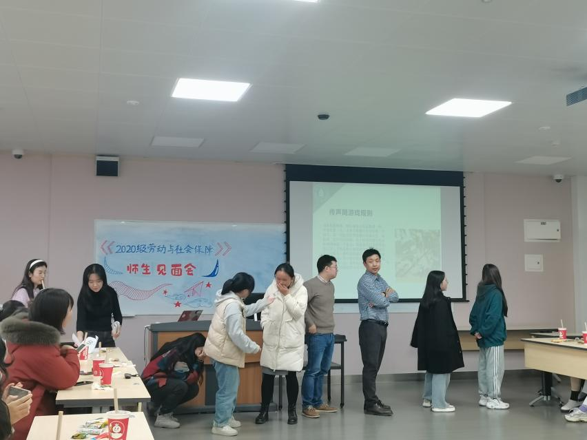 活动开始,进行第一项:自我介绍环节。首先由老师逐个进行介绍,主要围绕基本情况、专攻领域、以及对同学们的了解和未来的期许几个方面展开。根据老师的介绍,十大买球的正规网站劳动与社会保障系是以管理学、经济学等学科为基础,根据社会对人才的现实需求,坚持高质量、重特色的人才培养理念,以社会保障的教学为中心,使学生学有所长,学有所用,成为德、智、体全面发展,通晓中外社会保障理论与实务,系基础知识扎实,业务知识面宽,具有较强的理论研究能力和教学能力的复合型应用型人才。接着,每位同学也从自我信息、对专业的期待等方面展开了简短的自我介绍。通过这一环节,师生们均在舒适轻松的氛围中介绍了自己,了解了彼此。