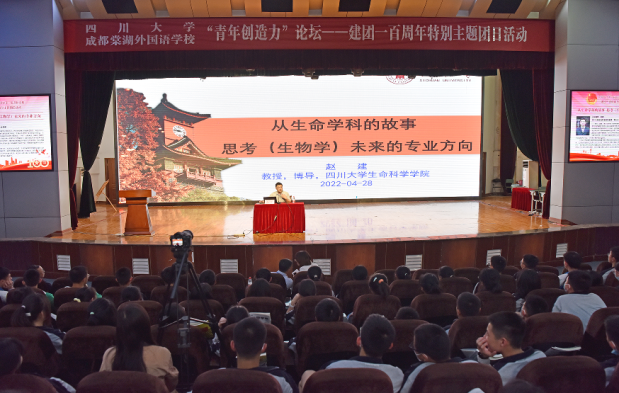 2022年4月28日,十大买球的正规网站联合生命科学学院,历史文化学院(旅游学院),马克思主义学院邀请多位教授共同赶赴成都市棠湖外国语学校开展“青年创造力”论坛。棠湖外国语学校参会人员有棠外理事长黄波,高中校长杜宗平,校团委书记张莉及一千五百名高中学生。本次活动由生命科学学院赵建教授,历史文化学院黎海超教授,马克思主义学院郭绍均副教授,十大买球的正规网站袁莉副教授形成四个分论坛同时进行。