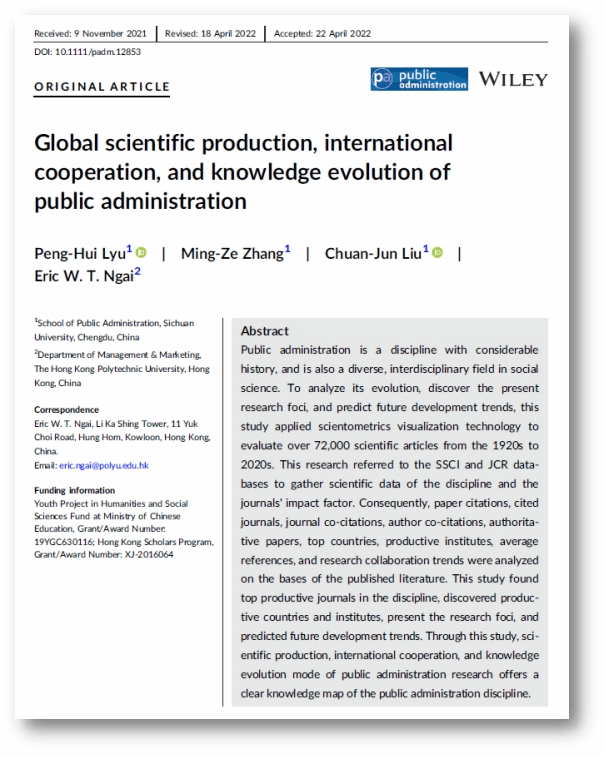 论文信息:Lyu, P.H., Zhang, M.Z., Liu, C.J., & Ngai, E.W.T. (2022). Global scientific production, international cooperation, and knowledge evolution of public administration. Public Administration, 1–29。