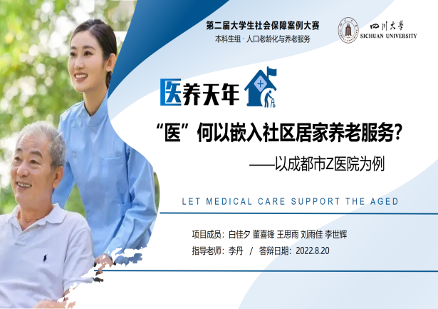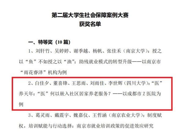 在劳动与社会保障系李丹教授的悉心指导下,由2019级劳动与社会保障专业本科生白佳夕、王思雨、刘雨佳、李世辉和行政管理专业本科生董喜锋五位同学组成的“‘医’养天年”队,克服疫情带来的种种不便,创作完成了案例分析报告《“医”养天年:“医”何以嵌入社区居家养老服务?——以成都市Z医院为例》。经过初赛的激烈竞争,团队最终在决赛阶段通过案例展示、现场答辩等环节的突出表现,一举斩获全国特等奖,充分展现了十大买球官网学子扎实的学术素养和浓厚的社会情怀。