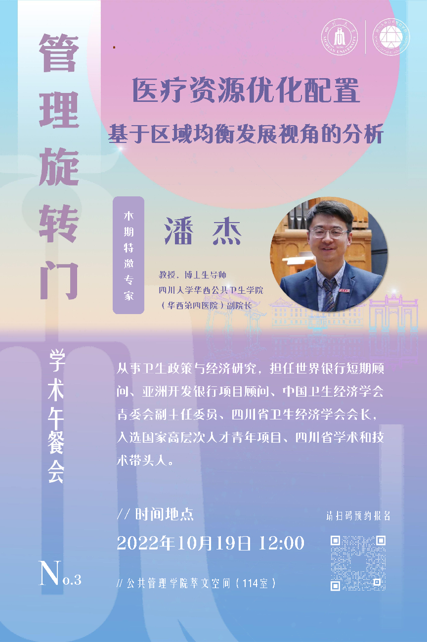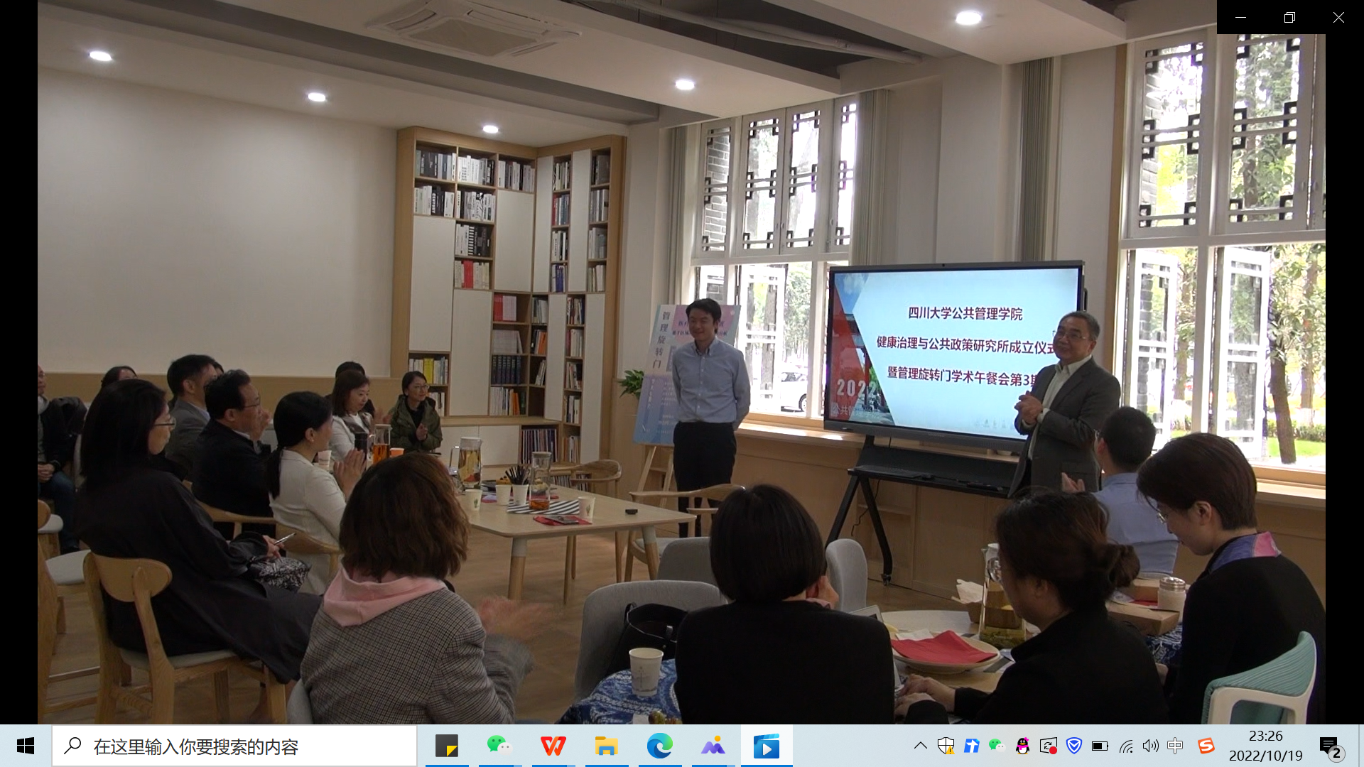 2022年10月19日,十大买球的正规网站健康治理与公共政策研究所成立仪式和第3期“管理旋转门”学术沙龙在学院共享空间(萃文空间)举行。本次活动特邀华西公共卫生学院(华西第四医院)副院长、博士生导师潘杰教授作为主讲嘉宾,学院各系老师积极参加了此次学术活动。
