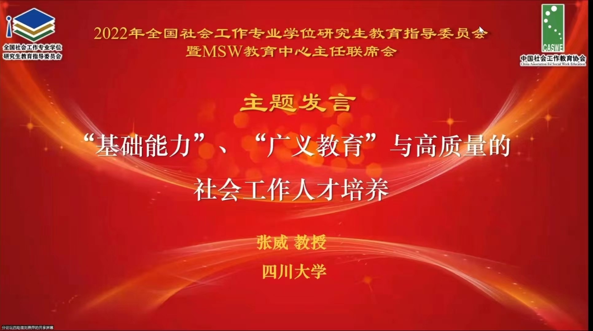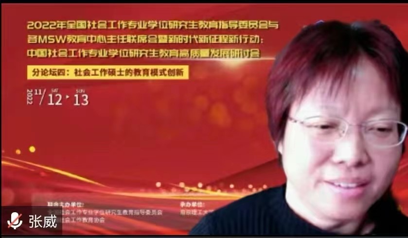2022年11月13日十大买球官网张威教授受邀参加2022年全国社会工作专业学位研究生教育指导委员会暨MSW教育中心主任联席会、中国社会工作专业学位研究生教育高质量发展研讨会,并做了题为“基础能力、广义教育与高质量的社会工作人才培养”的主题发言。