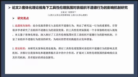 11月3日至4日,由《管理学报》杂志社发起,国家自然科学基金委员会管理科学部和《人力资源管理评论》杂志支持,中国管理现代化研究会组织行为与人力资源管理专业委员会、南京大学商学院、华中科技大学管理学院和华侨大学工商管理学院主办,华侨大学工商管理学院承办的“第十届中国人力资源管理论坛暨十周年庆典”以“线上”形式召开。刘传军课题组硕士研究生王星元在分组论坛一中就《客体化理论视角下工具性伦理氛围对亲组织不道德行为的影响机制研究》一文进行了口头报告,该研究探讨了客体化理论在亲组织不道德行为中的影响机制,检验了自我客体化与道德推脱在工具性伦理氛围与亲组织不道德行为中的中介作用,为组织管理方面提供了一定启示。
