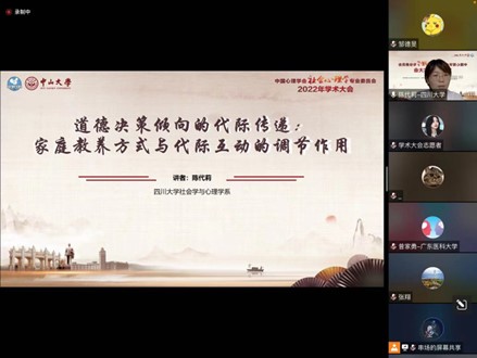 今年9月17日至18日,中国心理学会社会心理学专业委员会2022年学术大会在广东省广州市召开。刘传军课题组硕士研究生陈代莉线上到会,并在“亲社会与道德”分组论坛中就《道德决策倾向的代际传递:家庭教养方式与代际互动的调节作用》一文进行了口头报告,该研究探讨了道德决策倾向在家庭内部是否存在亲子间的代际传递,并检验了家庭教养方式与代际互动在这一传递路径中的调节作用。