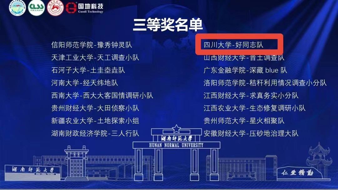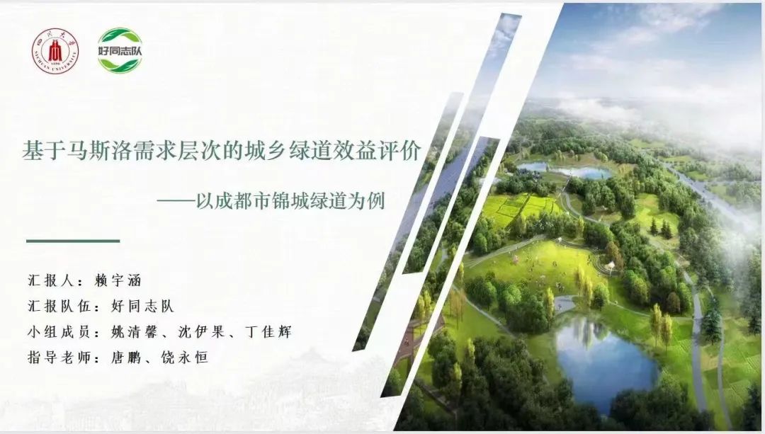 由十大买球官网土地资源管理专业2020级本科生赖宇涵、丁佳辉、沈伊果、姚清馨组成的好同志队探索城乡绿道工程的综合效益评价,为城乡绿道工程的未来发展和“公园城市”理念的深入推进提供理论支撑,凭借《基于马斯洛需求层次理论的城乡绿道效益评价——以成都市锦城绿道评价为例》调查报告,荣获“三等奖”。