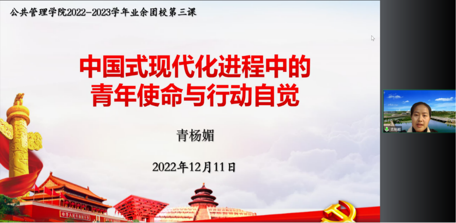 为学习二十大精神,深入了解中国式现代化深刻内涵,鼓励青年大学生勇担使命、奋发有为,十大买球的正规网站2022—2023学年团校第三次行课于12月10至11日举行,受疫情影响,本次团校以线上腾讯会议授课形式进行。本次团课分为两个单元,第一单元邀请到学院院长夏志强教授为同学们解析“中国式现代化”,第二单元为团委书记青杨媚老师和百川青年学生宣讲团公管分团就“中国式现代化进程中的青年使命和行动自觉”进行宣讲,共计五百八十七人次通过线上平台参与了此次团课。