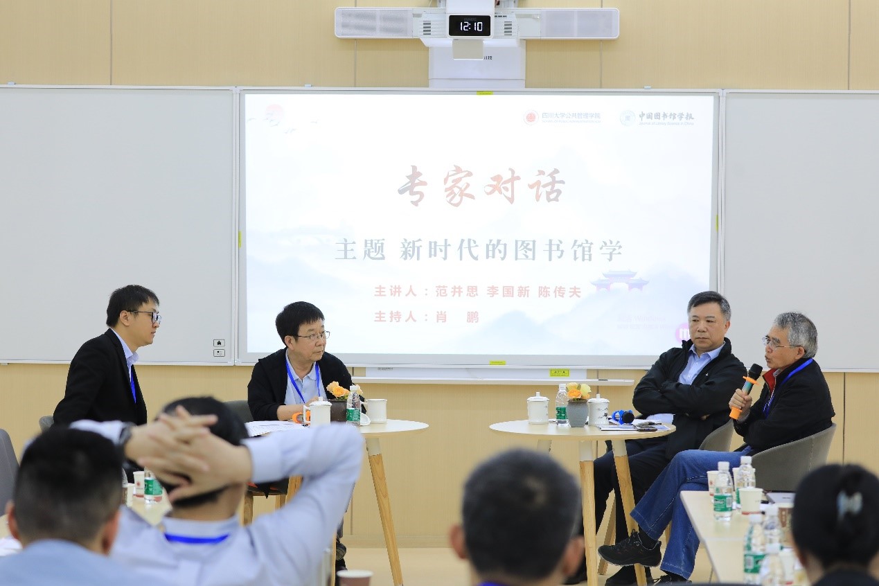 第二场专家对话的主题是“新时代的图书馆学”,华东师范大学信息管理系范并思教授、北京大学信息管理系李国新教授、武汉大学信息管理学院陈传夫教授展开交流,南开大学商学院于良芝教授以视频形式远程分享观点,中山大学信息管理学院肖鹏副教授主持。于良芝教授从底层逻辑概念回应了图书馆学基础内容,认为要借助诸如知识和信息等更基础的概念,从学科概念链条的前端重新科学和准确地定义图书馆;而由于图书馆学承载着文化内涵,也需要用文化、教育、科技等加以定义。范并思教授认为图书馆专业精神以服务为核心体现,图书馆需要通过学界和业界积极对外发声构建理念共识,将服务与彰显核心价值、使命相结合,推动理论和实践更好创新。李国新教授认为当前各类型图书馆差异进一步扩大,现有图书馆学理论不足以解释图书馆面临的实践问题,要充分警惕理论和实践脱节对学科发展的潜在威胁,应以实践问题为导向重构图书馆学理论基础;同时,以公共图书馆为代表的实践具有鲜明的中国特色,需要对其展开深入研究;陈传夫教授提出,图书馆就是要致力于塑造国民素质和文化精神,因而要通过制度保障图书馆专业精神;同时,图书馆学应认识到理论研究的重要性和多重功能,把握学科更名的发展机遇,坚定信念,扎根大地、联系实际,把图书馆学推向前进。扎根中国大地开展研究,凸显学科特色,构建学科共识,通过扩大自身贡献来提升学科话语权。