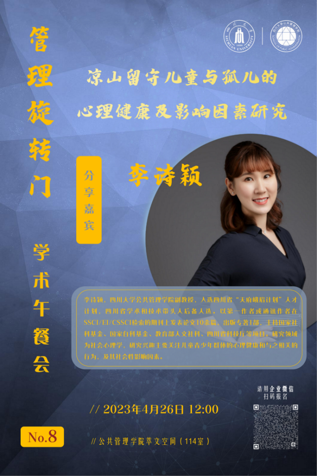 李诗颖副教授长期聚焦儿童青少年群体的心理健康行为研究,分享了其运用心理学研究范式,通过问卷调研和访谈等研究方法,深入四川省凉山彝族自治州开展的关于留守儿童与孤儿的心理健康及影响因素的研究成果。