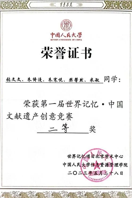 5月28日,“世界记忆•中国文献遗产创意竞赛”决赛于中国人民大学举行。此次比赛由世界记忆项目中国国家委员会、联合国教科文组织世界记忆项目学术中心工作组、教育部高等学校档案学专业教学指导委员会指导,世界记忆项目北京学术中心与中国人民大学信息资源管理学院联合世界记忆项目澳门学术中心、苏州学术中心、福建学术中心,以及中国第一历史档案馆、苏州市工商档案管理中心、孔子博物馆等多家机构共同推出。大赛发布后,全国各地高校热烈响应,比赛共吸引来自29个省(自治区/直辖市)、112所高校的档案学、图书情报、艺术设计、历史学等专业155支团队,共631位大学生报名。