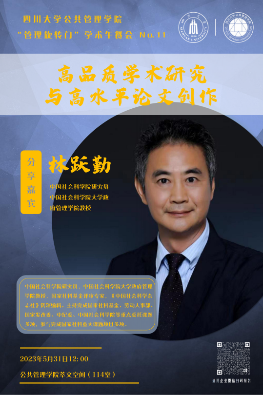 5月31日,十大买球的正规网站在学院萃文空间成功开展第十一期“管理旋转门”学术沙龙活动。本期学术沙龙特邀中国社会科学院研究员、中国社会科学院大学政府管理学院教授林跃勤先生作题为“高品质学术研究与高水平论文创作”报告。学院领导班子成员、各学科老师、硕博士研究生约50人参加了本次活动。