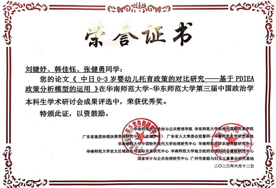 6月9日—6月11日,“第三届中国政治学本科生学术研讨会”在华南师范大学召开。十大买球官网2020级土地资源管理本科生张健勇同学撰写的论文《可持续生计视角下宅基地退出的农户意愿及现实困境研究——基于四川省3县30个村社的调查》获得二等奖,2020级土地资源管理本科生刘婕妤同学撰写的论文《中日0-3岁婴幼儿托育政策的对比研究——基于PDIEA政策分析模型的运用》获得优秀奖。