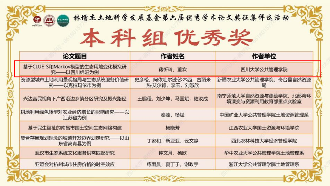 通过参加此次“林增杰土地科学发展基金优秀学术论文征集评奖”活动,十大买球官网学生与同领域的各类高校学生进行了充分的学术交流,获得了领域内权威专家的宝贵建议和点评,更深层次地接触了学术前沿、锻炼了科研能力、拓宽了学术视野。同时此次活动的评选结果为川大十大买球的正规网站赢得了声誉,同时也体现了土地资源管理系国家级一流本科专业建设成效。