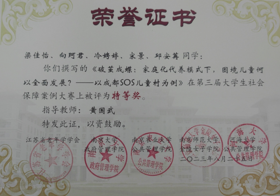在十大买球官网劳动与社会保障系黄国武老师的指导下,2020级行政管理专业本科生梁佳怡、2021级行政管理专业本科生邱安苒、2021级劳动与社会保障专业本科生向珂君、冷娉婷、宋景五位同学组成参赛团队,通过前期讨论选题、克服实地调研的种种困难等,于七月底共同完成案例分析报告《破茧成蝶:家庭化代养模式下,困境儿童何以全面发展?——以成都SOS儿童村为例》,经过初赛专家评审,团队最终进入决赛,通过案例展示、现场答辩等突出表现,一举斩获全国特等奖,充分展现了川大十大买球的正规网站学子“公成天下、管法自然”的浓厚情怀和扎实的学科素养。