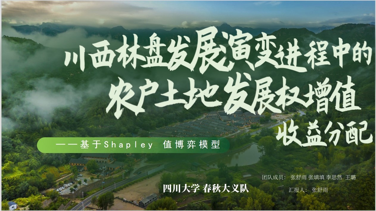 在唐鹏老师和饶永恒老师指导下, 2021级土地资源管理专业本科生张舒雨、张填填、李思然、王璐组成“春秋大义队”参赛,提交作品《川西林盘发展演变进程中的农户土地发展权增值收益分配研究——基于Shapley值博弈模型》探寻了完善国家、集体和个人在集体经营性建设用地增值收益的分配机制,对推进国土空间格局优化与和美乡村建设等的相关实践成效进行调研与分析研究,充分展现了新时代大学生探索土地国情、认识土地国情、奉献土地国情的情怀和能力。经过决赛答辩环节,参赛作品最终斩获“全国二等奖”,唐鹏和饶永恒老师荣获“优秀指导教师”。