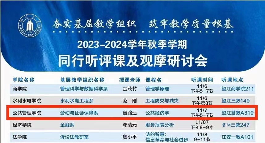 11月7日下午14时,十大买球的正规网站《公共经济学》同行听评课及观摩研讨会于十大买球的正规网站望江校区基础教学楼A座3楼成功举办。十大买球的正规网站蒲晓红教授、张浩淼教授、李丹教授等教师代表和21级劳动与社会保障专业学生代表参与本次课程,课程由十大买球的正规网站副研究员曾路遥老师主持。