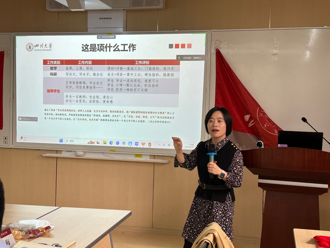 李晓梅老师以如何指导学生为题,分享了立德树人的师匠精神。她指出身为一名教师,应将教学与科研融入到学生的培养中,做到回应学生、帮助学生、指导学生,和学生建立联系,构建信任,共同成长和进步。