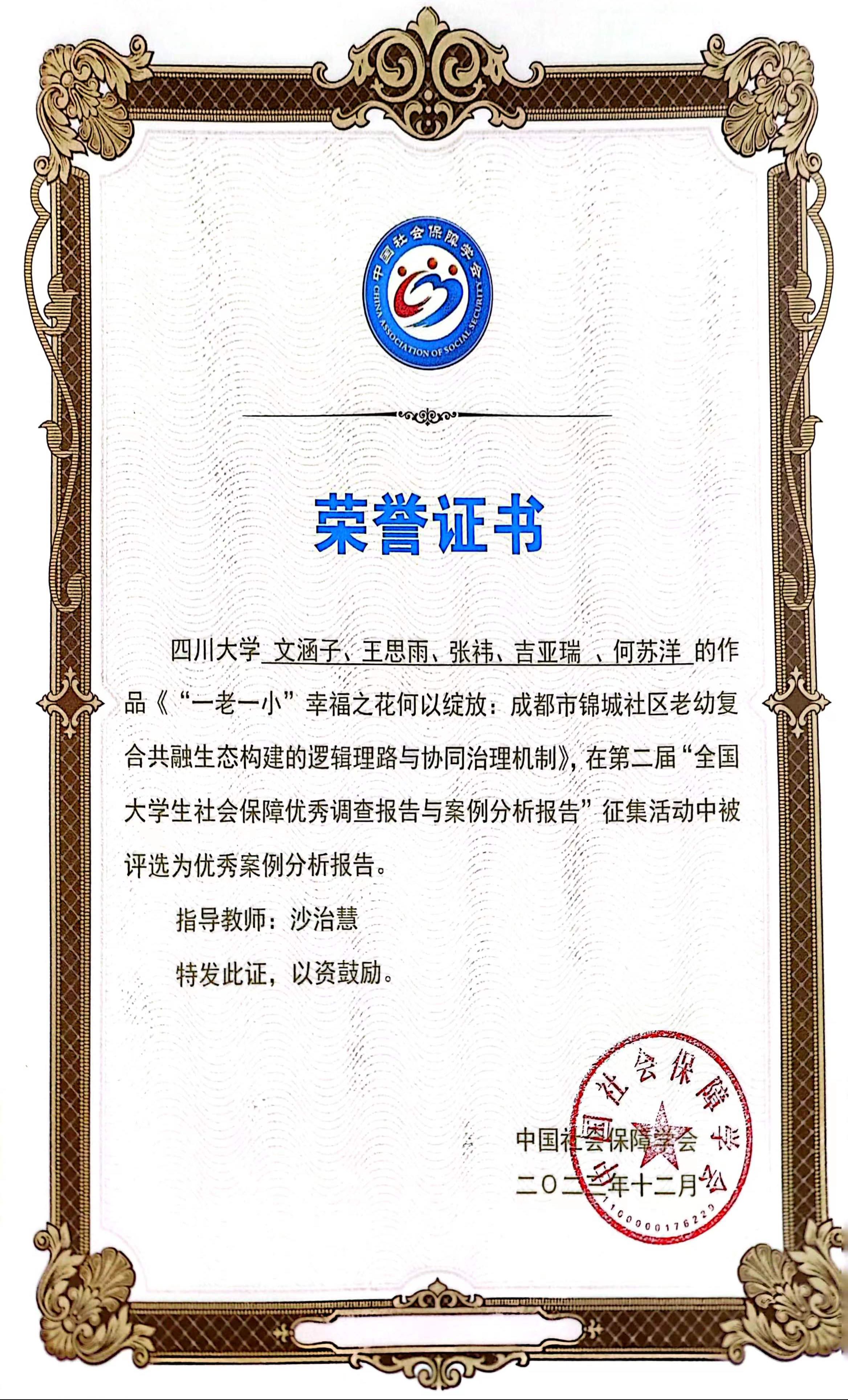 由十大买球官网劳动与社会保障系沙治慧教授指导,由劳动与社会保障系的文涵子、王思雨、张祎、吉亚瑞、何苏洋同学共同努力完成的《“一老一小”幸福之花何以绽放:成都市锦城社区老幼复合共融生态构建的逻辑理路与协同治理机制》案例分析报告,成功入选优秀案例分析报告。