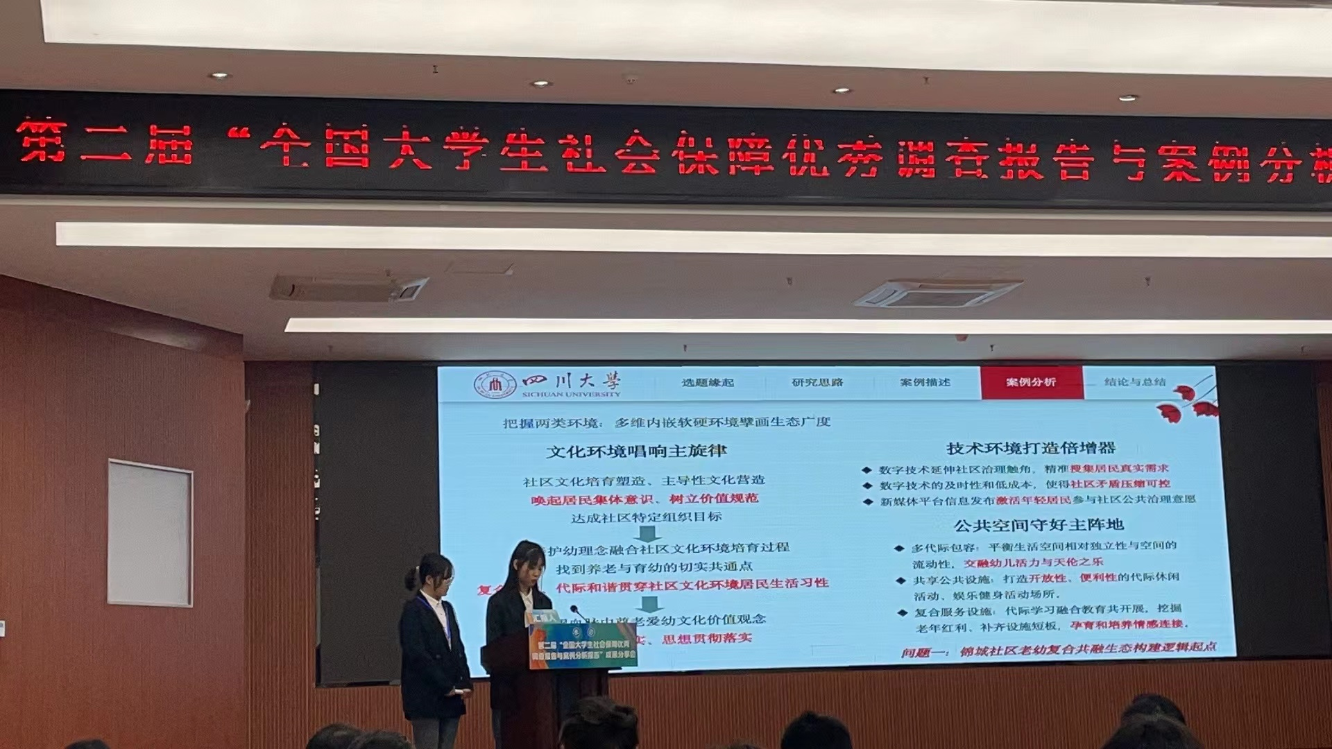 团队成员在沙治慧教授的带领下,围绕成都市锦城社区老幼共融生态展开了一系列调查研究,为实现代际互惠、推动养老托育服务供给体系优化提供了创新思路及实践进路。12月10日,王思雨、张祎同学代表团队在获奖成果分享会上共析研究焦点、同享研究结论。