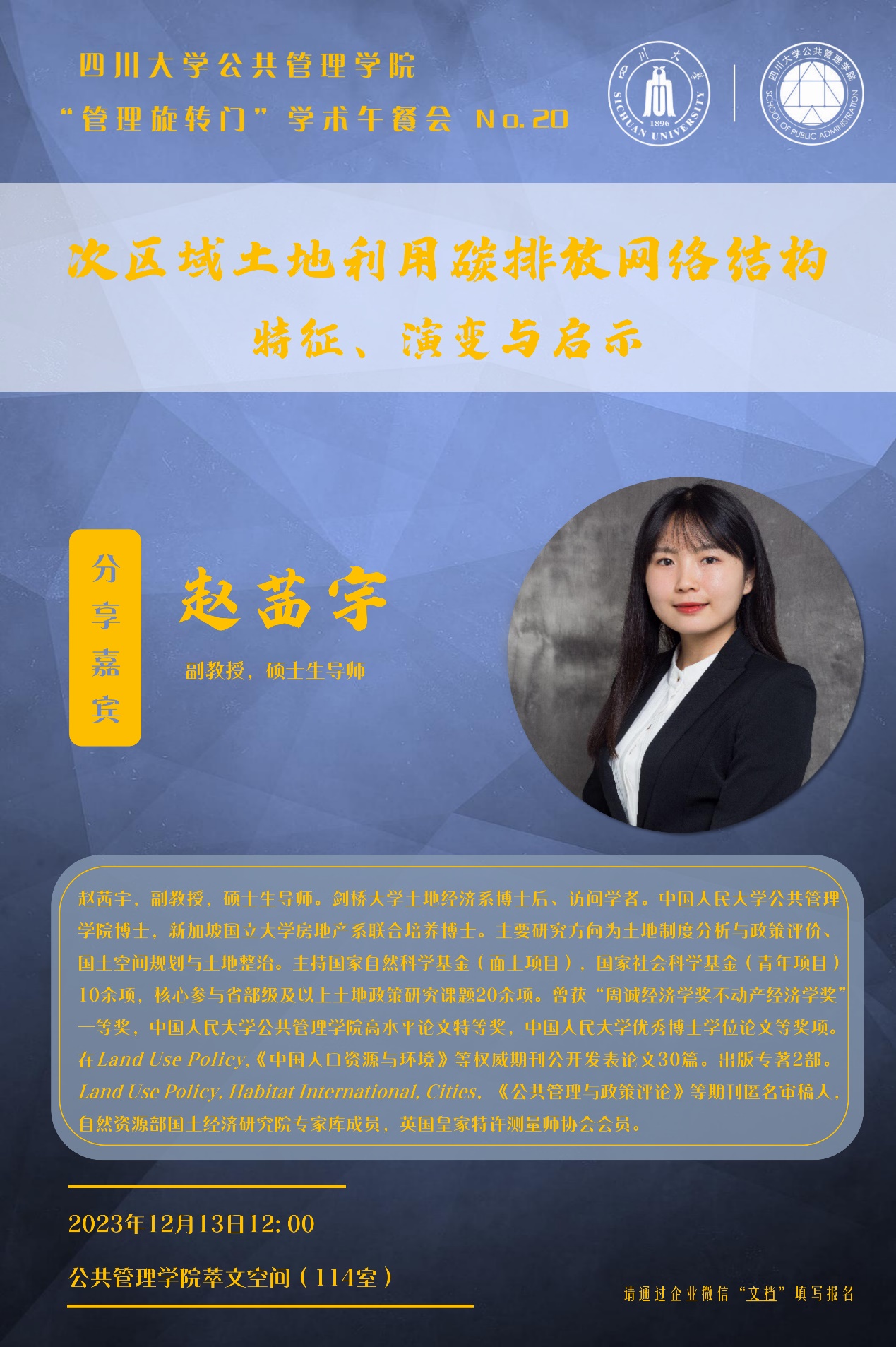 12月13日,十大买球的正规网站在学院楼萃文空间成功开展第二十期“管理旋转门”学术沙龙活动。此次学术沙龙特邀剑桥大学土地经济系博士后、访问学者赵茜宇副教授分享“次区域土地利用碳排放网络结构:特征、演变与启示”,学院各学科老师、硕博研究生积极参加了此次跨学科交流。本期沙龙由劳动与社会保障系田益豪副研究员担任学术主持。