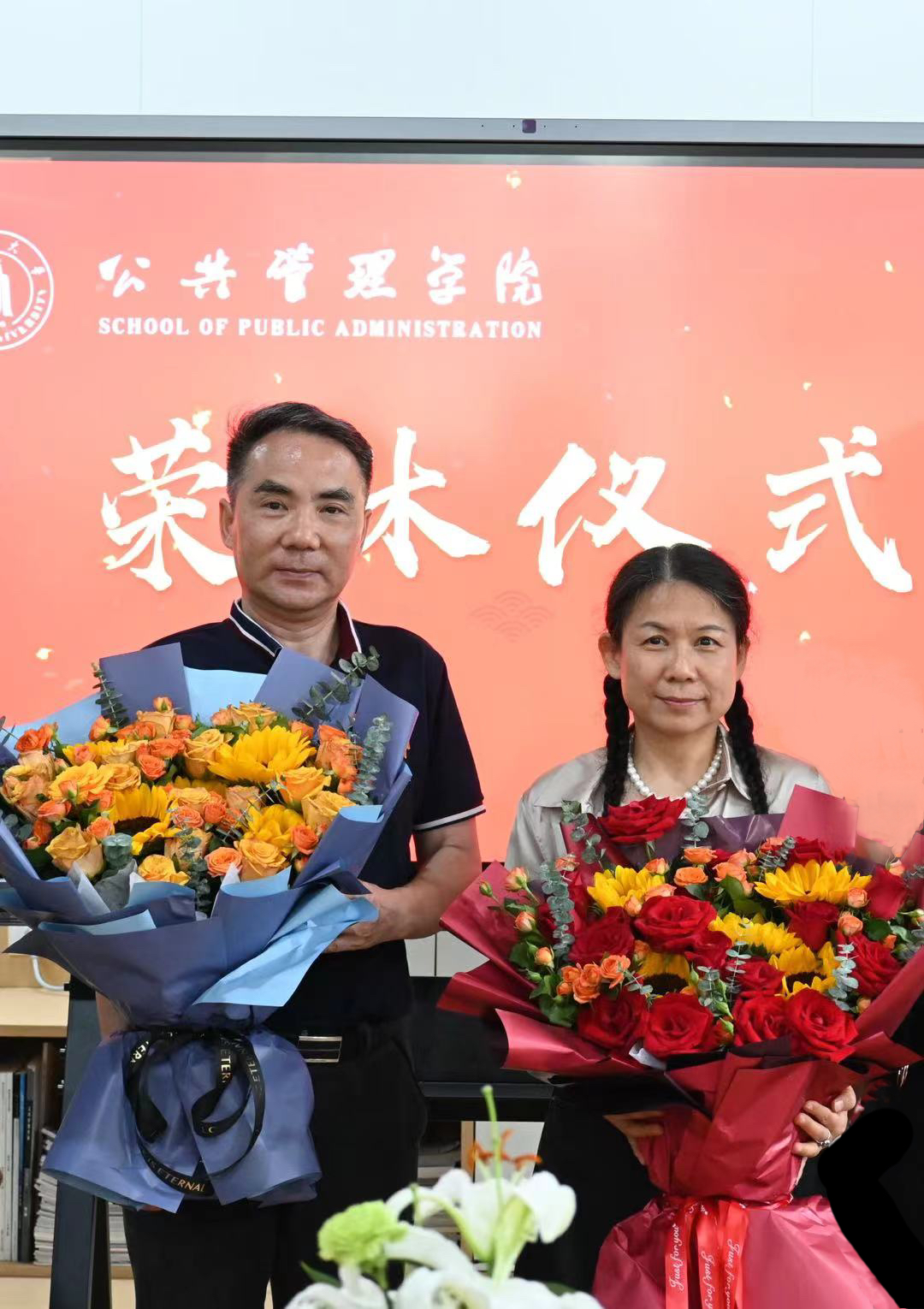 学院领导班子成员为两位老师颁发荣休纪念章和纪念相册。同事代表、离退休教师代表、院友代表以及学生代表纷纷表达对两位老师的诚挚祝福并献花。在温馨的餐叙氛围中,荣休仪式圆满结束。