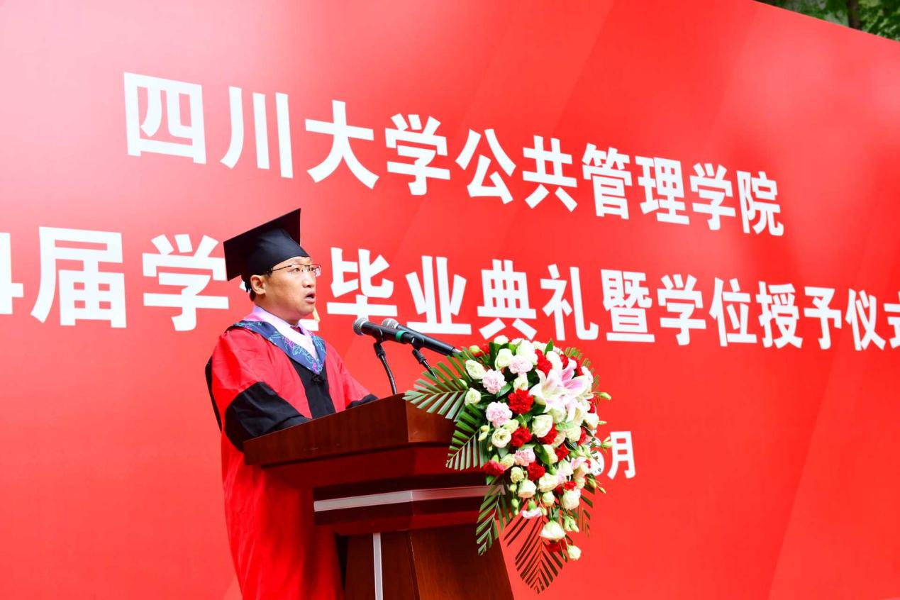 校友代表2012级行政管理硕士研究生、成都经开资本运营集团有限公司党委副书记张亚珠告诫学弟学妹,要在未来的学习和工作中着重培养自身的实践能力、反思能力和心理调适能力。无论遇到什么困难,都要忠于自己、善待他人;要常怀感恩之心,常念父母之恩、恩师之情、同窗之谊,并将感恩之心传递下去。