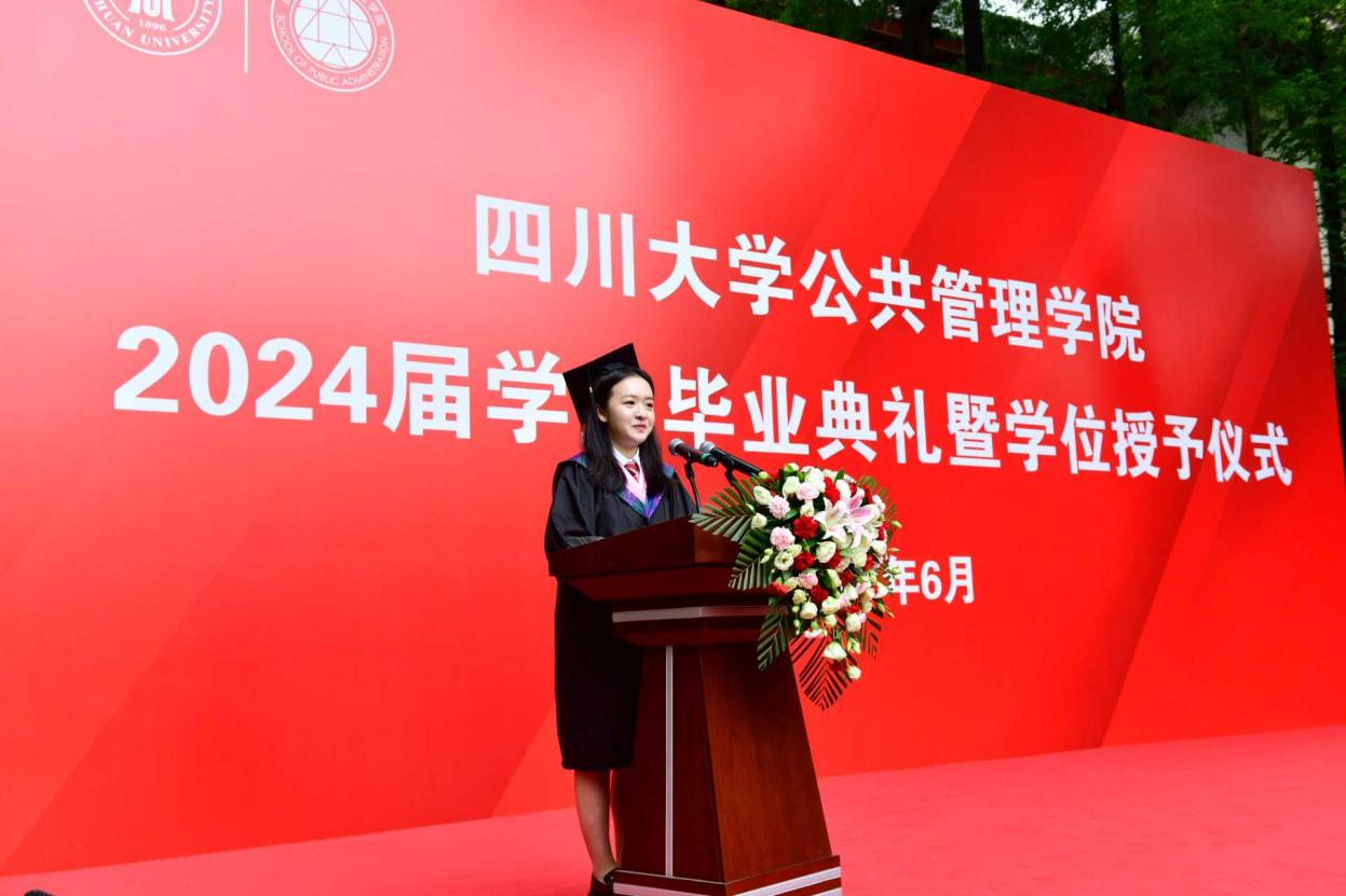 研究生毕业生代表江昕芮在发言中表示,在未来的日子里,将把在十大买球的正规网站学到的知识贡献到国家发展和社会进步中。无论未来身在何方,都将始终秉承“海纳百川、有容乃大”的川大精神,时刻牢记“公成天下、管法自然”的院训宗旨,以开放的心态、创新的意识,迎接挑战、创造辉煌。