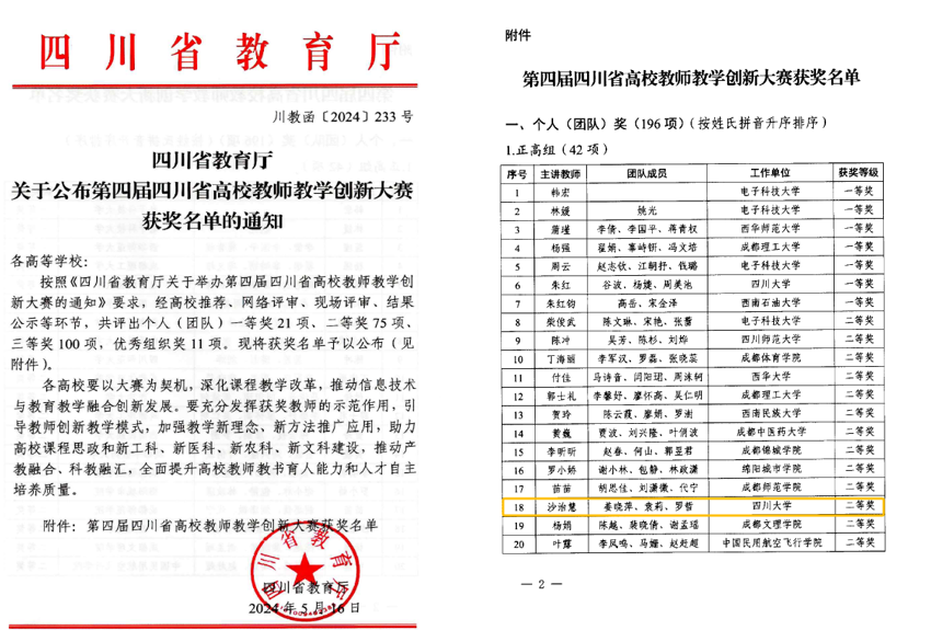 近日,四川省教育厅发布了《关于公布第四届四川省高校教师教学创新大赛获奖名单的通知》,十大买球官网沙治慧教授团队获得正高组二等奖。本次大赛以“推动教学创新、培养一流人才”为主题,全省55所高校,2019个教师(团队),5537名教师参加校赛;322个教师(团队),1195名教师参加省赛。