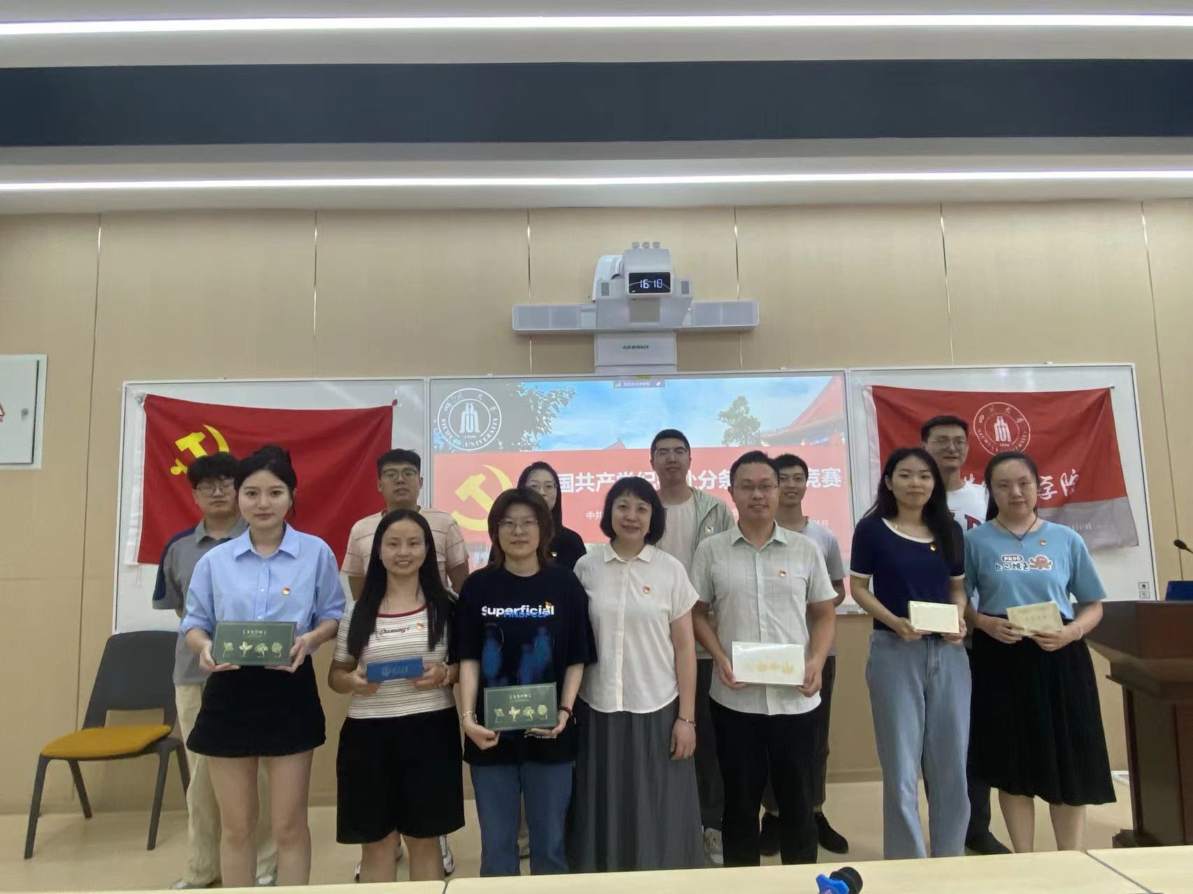组织委员李丹姣同志主持了党纪知识竞赛。竞赛以必答题和抢答题的形式进行,四组选手在紧张有序的答题环节中拼手速、比脑力,考记忆。经过激烈角逐,2022级博士生程越欣、刘艳灵、王羽西组成的第三组获得一等奖。